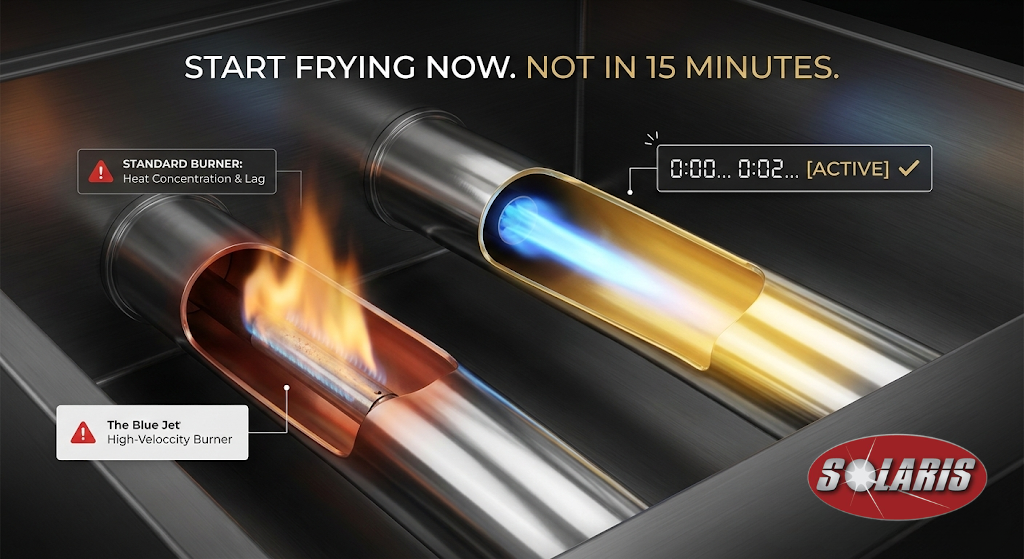 When we engineered the Solaris gas energy fryer line, we didn’t just try to build a bigger burner. We approached the start-up cycle as a geometry and velocity challenge.